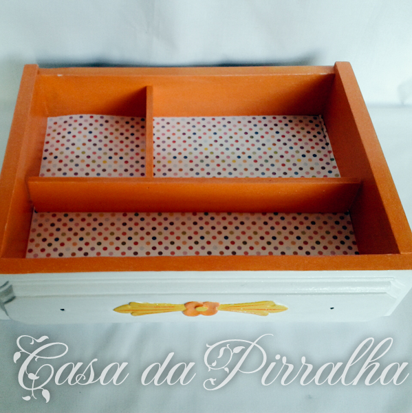 Já tinha aqui uma gaveta catita, mas ainda faltava qualquer coisa... Organização! Isto era para ser, afinal de contas, uma mesinha de cabeceira virada cantinho de cosmética. Pintei umas barras de madeira e colei na gaveta. Comprei ainda dois puxadores amarelos a combinar et voilá, linda e funcional!