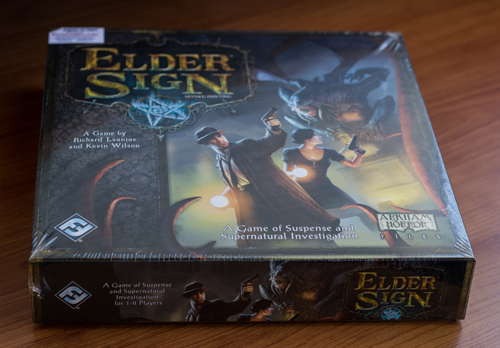 Elder Sign é um jogo de tabuleiro cooperativo, com dados, de suspense e investigação do sobrenatural que se pode jogar sozinho ou com até mais sete pessoas.