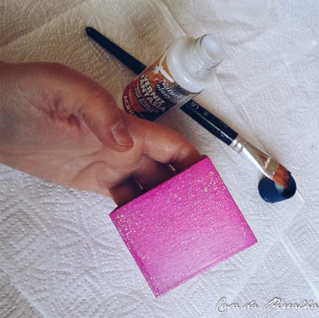 1- Por dentro da caixinha apliquei verniz de fantasia em acrílico: na parte de baixo, para ela ficar com glitter, por dentro e por fora; assim como por dentro, na tampa.