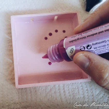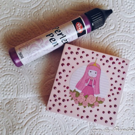 4- Depois disto apliquei, como sou doidinha por estas pérolas, mais perl pen na tampa, desta vez na parte de cima, depois da laca solúvel ter secado. Esperei mais 3 horas, para as pérolas secarem.